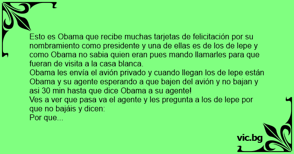 Obama les envía el avión privado y cuando llegan los de lepe están Obama y su agente esperando a que bajen del avión y no bajan y asi 30 min hasta que dice Obama a su agente!