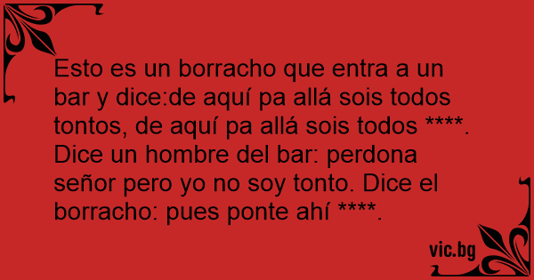 Esto es un borracho que entra a un bar y dice:de aquí pa allá sois todos tontos, de aquí pa allá sois todos ****. Dice un hombre del bar: perdona señor pero yo no soy тоnто. Dice el borracho: pues ponte ahí ****.
