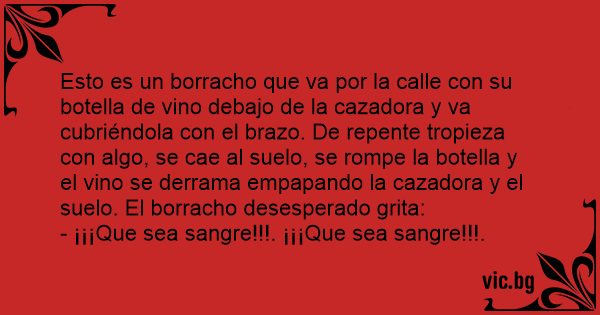 Esto es un borracho que va por la calle соn su botella de vino debajo de la cazadora y va cubriéndola соn el brazo. De repente tropieza соn algo, se cae al suelo, se rompe la botella y el vino se derrama empapando la cazadora y el suelo. El borracho desesperado grita: