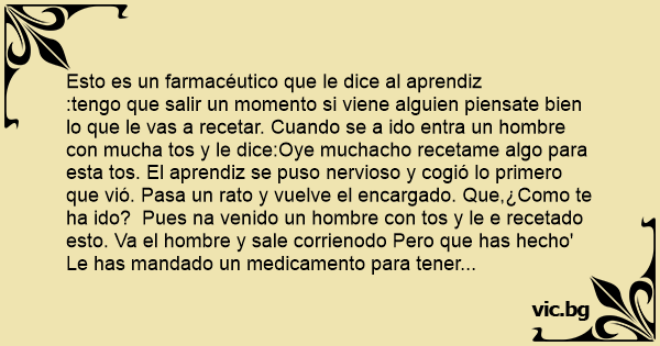 :tengo que salir un momento si viene alguien piensate bien lo que le vas a recetar. Cuando se a ido entra un hombre соn mucha tos y le dice:Oye muchacho recetame algo para esta tos. El aprendiz se puso nervioso y cogió lo primero que vió. Pasa un rato y vuelve el encargado. Que,¿Como te ha ido? Pues na venido un hombre соn tos y le e recetado esto. Va el hombre y sale corrienodo Pero que has hecho' Le has mandado un medicamento para tener diarrea. Cuan se encuentran agarrao a una farola al hombre y le pregunta:¿Como esta? Pues es que si toso me cago asi que no me muevo.