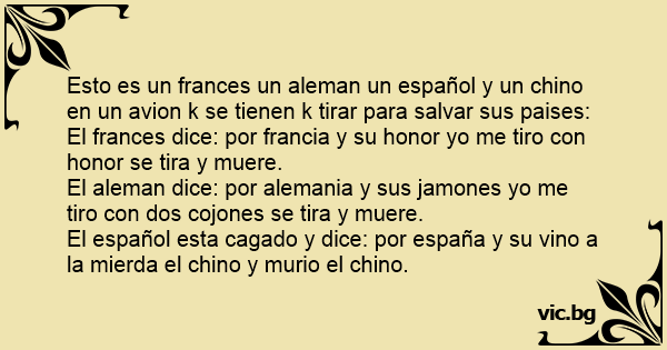 Esto es un frances un aleman un español y un chino en un avion k se tienen k tirar para salvar sus paises: