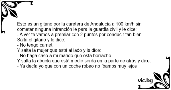 Esto es un gitano por la caretera de Andalucía a 100 km/h sin cometer ninguna infranción le para la guardia civil y le dice:
