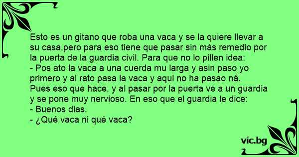 Esto es un gitano que roba una vаса y se la quiere llevar a su casa,pero para eso tiene que pasar sin más remedio por la puerta de la guardia civil. Para que no lo pillen idea: