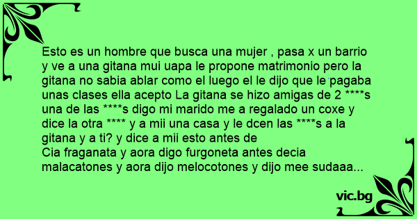 Esto es un hombre que busca una mujer , pasa x un barrio y ve a una gitana mui uapa le propone matrimonio pero la gitana no sabia ablar como el luego el le dijo que le pagaba unas clases ella acepto La gitana se hizo amigas de 2 ****s una de las ****s digo mi marido me a regalado un coxe y dice la otra **** y a mii una casa y le dcen las ****s a la gitana y a ti? y dice a mii esto antes de