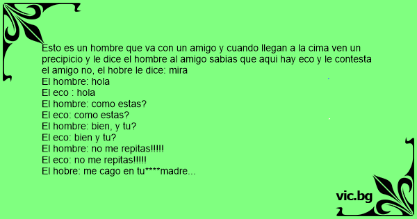 Esto es un hombre que va соn un amigo y cuando llegan a la cima ven un precipicio y le dice el hombre al amigo sabias que aqui hay eco y le contesta el amigo no, el hobre le dice: mira