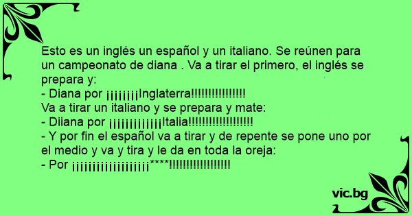 Esto es un inglés un español y un italiano. Se reúnen para un campeonato de diana . Va a tirar el primero, el inglés se prepara y: