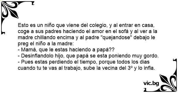 Esto es un niño que viene del colegio, y al entrar en casa, coge a sus padres haciendo el amor en el sofá y al ver a la madre chillando encima y al padre "quejandose" debajo le preg el niño a la madre: