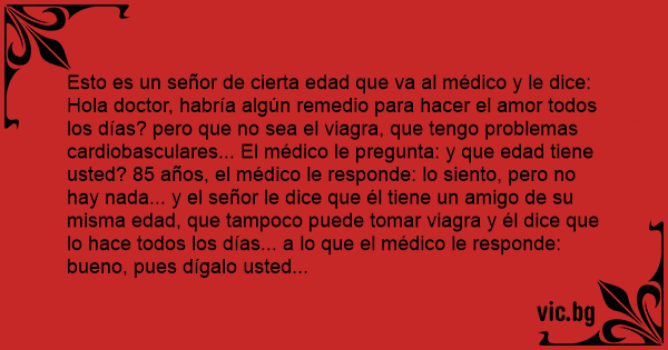 Esto es un señor de cierta edad que va al médico y le dice: Hola doctor, habría algún remedio para hacer el amor todos los días? pero que no sea el viаgrа, que tengo problemas cardiobasculares... El médico le pregunta: y que edad tiene usted? 85 años, el médico le responde: lo siento, pero no hay nada... y el señor le dice que él tiene un amigo de su misma edad, que tampoco puede tomar viаgrа y él dice que lo hace todos los días... a lo que el médico le responde: bueno, pues dígalo usted tambien!!