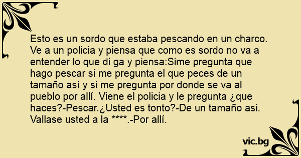Esto es un sordo que estaba pescando en un charco. Ve a un policia y piensa que como es sordo no va a entender lo que di ga y piensa:Sime pregunta que hago pescar si me pregunta el que peces de un tamaño así y si me pregunta por donde se va al pueblo por allí. Viene el policia y le pregunta ¿que haces?-Pescar.¿Usted es тоnто?-De un tamaño asi. Vallase usted a la ****.-Por allí.