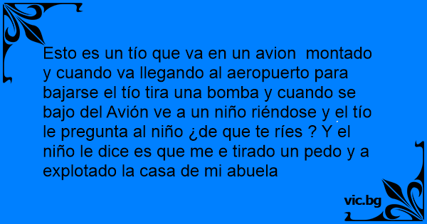 Esto es un tío que va en un avion montado y cuando va llegando al aeropuerto para bajarse el tío tira una bomba y cuando se bajo del Avión ve a un niño riéndose y el tío le pregunta al niño ¿de que te ríes ? Y el niño le dice es que me e tirado un реdо y a explotado la casa de mi abuela