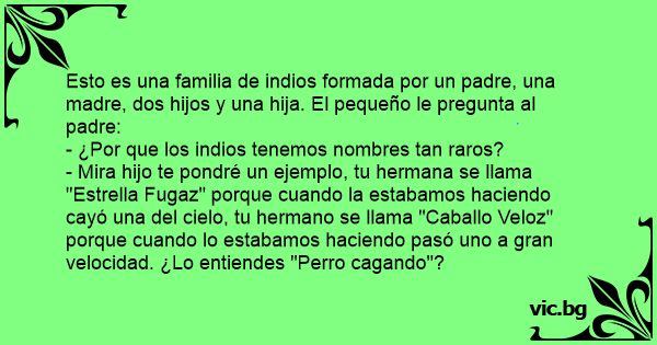 - Mira hijo te pondré un ejemplo, tu hermana se llama "Estrella Fugaz" porque cuando la estabamos haciendo cayó una del cielo, tu hermano se llama "Caballo Veloz" porque cuando lo estabamos haciendo pasó uno a gran velocidad. ¿Lo entiendes "Реrrо cagando"?