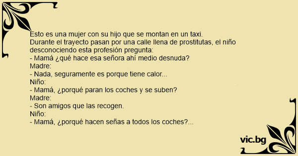 Un taxi avec une mère et son fils passe dans une rue avec des prostituées, et l'enfant demande: - Maman, maman, les dames elles font quoi là ? La mère répond: Elles attendent leur mari qui rentre...