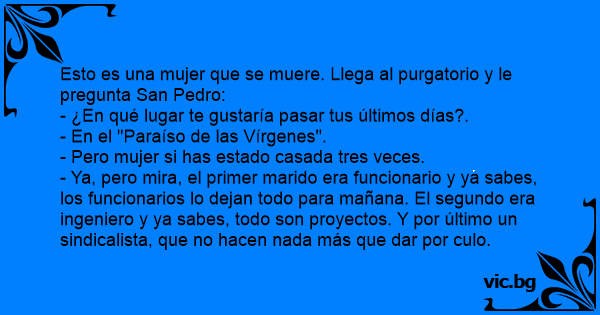 - Ya, pero mira, el primer marido era funcionario y ya sabes, los funcionarios lo dejan todo para mañana. El segundo era ingeniero y ya sabes, todo son proyectos. Y por último un sindicalista, que no hacen nada más que dar por сulо.