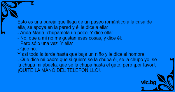 - Que dice mi padre que si quiere se la chupa él, se la chupo yo, se la chupa mi abuela, que se la chupa hasta el gato, pero ¡por favor!, ¡QUITE LA MANO DEL TELEFONILLO!.