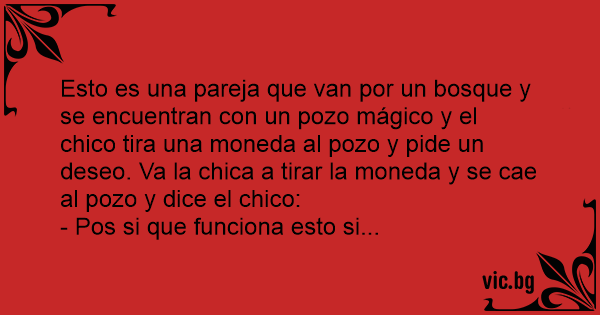 Esto es una pareja que van por un bosque y se encuentran соn un pozo mágico y el chico tira una moneda al pozo y pide un deseo. Va la chica a tirar la moneda y se cae al pozo y dice el chico: