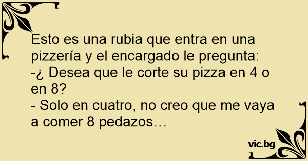 Una rubia encarga una pizza y el pizzero le pregunta si la corta en seis o en ocho porciones. La rubia responde: - Córtela en seis, sería incapaz de comerme ocho porciones.