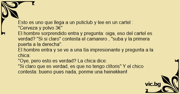 "Si claro que es verdad, es que no tengo clítoris" Y el chico contesta: bueno pues nada, ponme una heinekken!