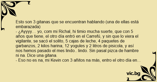 - ¿Ayyyy… yo, com mi Richal, hi timio mucha suerte, que соn 5 años que tiene, el otro día entró en el Carrefú, y sin que lo viera el vigilante, se sacó el solito, 5 cajas de leche, 4 paquetes de garbanzos, 2 kilos harina, 12 yogules y 2 litros de pisicola, y así nos hemos pasado el mes lindo.. lindo. Sin pasal pizca de hambre ni na. Dice una gitana.