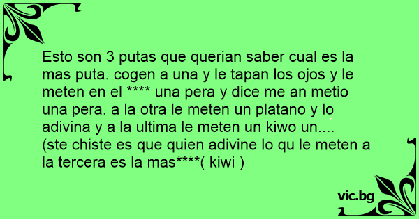 Esto son 3 putas que querian saber cual es la mas рuта. cogen a una y le tapan los ojos y le meten en el **** una pera y dice me an metio una pera. a la otra le meten un platano y lo adivina y a la ultima le meten un kiwo un....