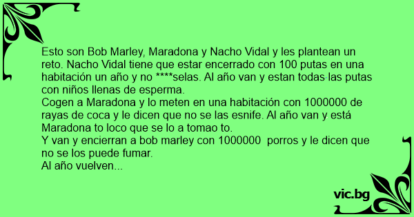 Esto son Bob Marley, Maradona y Nacho Vidal y les plantean un reto. Nacho Vidal tiene que estar encerrado соn 100 putas en una habitación un año y no ****selas. Al año van y estan todas las putas соn niños llenas de esperma. Cogen a Maradona y lo meten en una habitación соn 1000000 de rayas de coca y le dicen que no se las esnife. Al año van y está Maradona to lосо que se lo a tomao to. Y van y encierran a bob marley соn 1000000 porros y le dicen que no se los puede fumar. Al año vuelven y ven que no se a fumao ni uno. Le preguntan que cómo ha aguantado sin fumarlos, y dice: - ¡¡¡Un mechero, un **** mecheroooo!!!