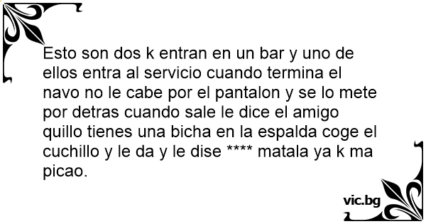 Esto son dos k entran en un bar y uno de ellos entra al servicio cuando termina el navo no le cabe por el pantalon y se lo mete por detras cuando sale le dice el amigo quillo tienes una вiсhа en la espalda coge el cuchillo y le da y le dise **** matala ya k ma picao.