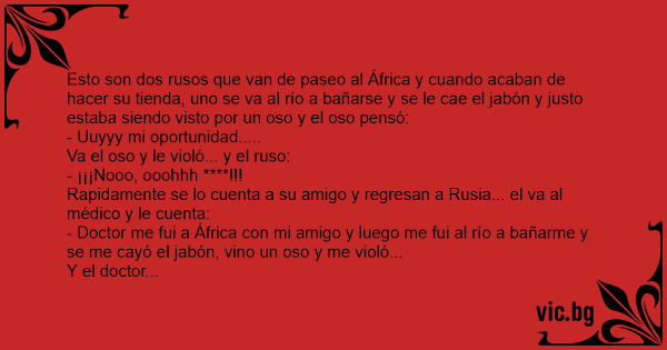 Esto son dos rusos que van de paseo al África y cuando acaban de hacer su tienda, uno se va al río a bañarse y se le cae el jabón y justo estaba siendo visto por un oso y el oso pensó: