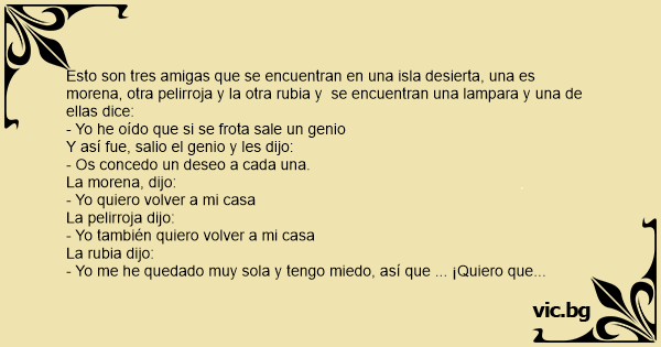 Eran tres hombres en una isla desierta, y de pronto se encuentran una lámpara mágica, y los tres hombres la frotan, de pronto sale el genio de la lámpara y les dice a los tres hombres que les va a...