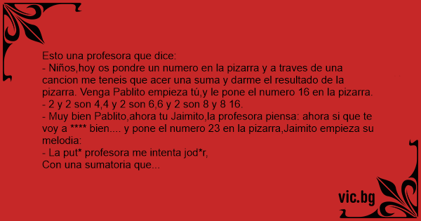 - Muy bien Pablito,ahora tu Jaimito,la profesora piensa: ahora si que te voy a **** bien.... y pone el numero 23 en la pizarra,Jaimito empieza su melodia: