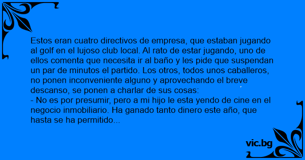 Estos eran cuatro directivos de empresa, que estaban jugando al golf en el lujoso club local. Al rato de estar jugando, uno de ellos comenta que necesita ir al baño y les pide que suspendan un par de minutos el partido. Los otros, todos unos caballeros, no ponen inconveniente alguno y aprovechando el breve descanso, se ponen a charlar de sus cosas: