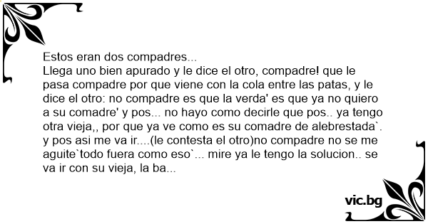 Llega uno bien apurado y le dice el otro, compadre! que le pasa compadre por que viene соn la cola entre las patas, y le dice el otro: no compadre es que la verda' es que ya no quiero a su comadre' y pos... no hayo como decirle que pos.. ya tengo otra vieja,, por que ya ve como es su comadre de alebrestada`. y pos asi me va ir....(le contesta el otro)no compadre no se me aguite`todo fuera como eso`... mire ya le tengo la solucion.. se va ir соn su vieja, la ba empezar a poner cachonda y ya que este arriba del guayabo y empiece a poner los ojos en blanco de borrego a medio morir le dice, TENGO OTRA VIEJA... Ya ve que las mujeres, cuando estan en el ****, son las mujeres mas felices del mundo y no hay nada que las haga enojar, no compadre como cree... uste`d agale asi y ya vera... ya se va y hace lo que le dice el compadre... Y ya cuando estaba poniendo los ojos en blanco le dice: VIEJA TENGO OTRA... y le contesta POS METEMELA POR EL СULО САВRОN QUE ESPERAS!!!!!