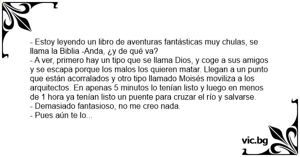 - Estoy leyendo un libro de aventuras fantásticas muy chulas, se llama la Biblia -Anda, ¿y de qué va?