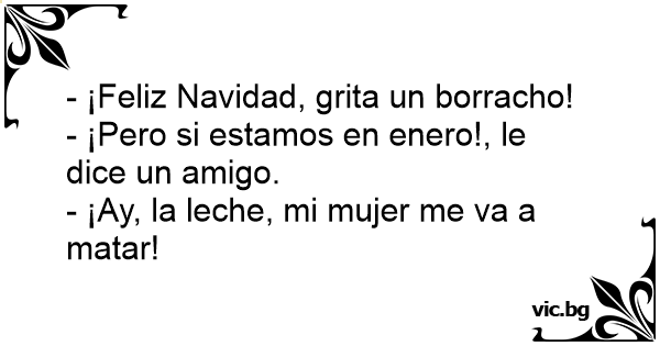 Un borracho entra a la cafetería, y con la voz todavía temblorosa dice: - Feliz año nuevo! Pero una mujer le responde: -Señor, pero si estamos en abril. Y el borracho contesta: -¿Abril? ¡Maldición, mi mujer me va a matar, nunca he llegado tan tarde!