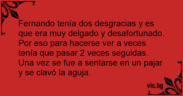 Fernando tenía dos desgracias y es que era muy delgado y desafortunado. Por eso para hacerse ver a veces tenía que pasar 2 veces seguidas. Una vez se fue a sentarse en un pajar y se clavó la aguja.