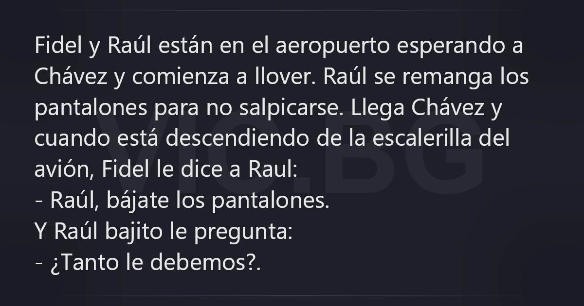 Fidel y Raúl están en el aeropuerto esperando a Chávez y comienza a llover. Raúl se remanga los pantalones para no salpicarse. Llega Chávez y cuando está descendiendo de la escalerilla del avión, Fidel le dice a Raul: