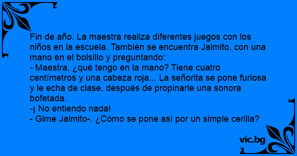 - Maestra, ¿qué tengo en la mano? Tiene cuatro centímetros y una cabeza roja... La señorita se pone furiosa y le echa de clase, después de propinarle una sonora bofetada.