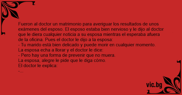 Fueron al doctor un matrimonio para averiguar los resultados de unos exámenes del esposo. El esposo estaba bien nervioso y le dijo al doctor que le diera cualquier noticia a su esposa mientras el esperaba afuera de la oficina. Pues el doctor le dijo a la esposa: