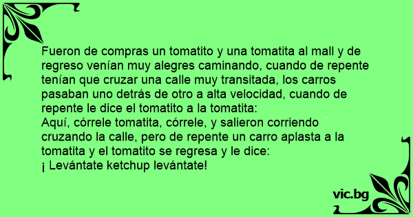 Fueron de compras un tomatito y una tomatita al mall y de regreso venían muy alegres caminando, cuando de repente tenían que cruzar una calle muy transitada, los carros pasaban uno detrás de otro a alta velocidad, cuando de repente le dice el tomatito a la tomatita: