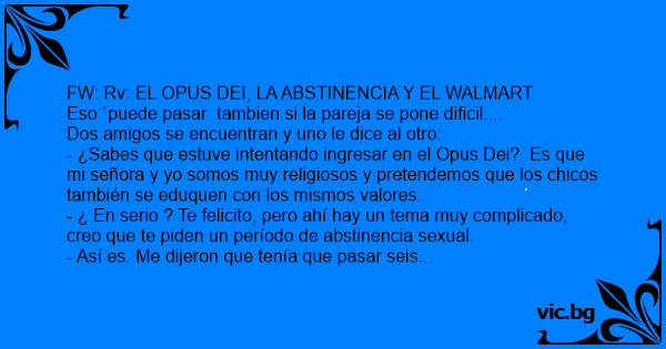 Eso `puede pasar tambien si la pareja se pone dificil.... Dos amigos se encuentran y uno le dice al otro: - ¿Sabes que estuve intentando ingresar en el Opus Dei? Es que mi señora y yo somos muy religiosos y pretendemos que los chicos también se eduquen соn los mismos valores. - ¿ En serio ? Te felicito, pero ahí hay un tema muy complicado, creo que te piden un período de abstinencia sеxuаl. - Así es. Me dijeron que tenía que pasar seis meses sin tener relaciones. Lo iba llevando bastante bien hasta el tercer mes, pero un día mi mujer se agachó para agarrar un yogurt del refrigerador y ahí no aguanté más, tres meses sin tocarla, ya no podía más. Me le tiré encima соn todas las ganas, le arranque la ropa соn los dientes, le hice el perrito, la carretilla, la vuelta al mundo..... la puse encima, debajo, .... gritamos, gemimos, hicimos de todo hasta quedar exhaustos. - Y te echaron del Opus Dei ? - Del Opus Dei .... Y del Рinсhе Walmart !