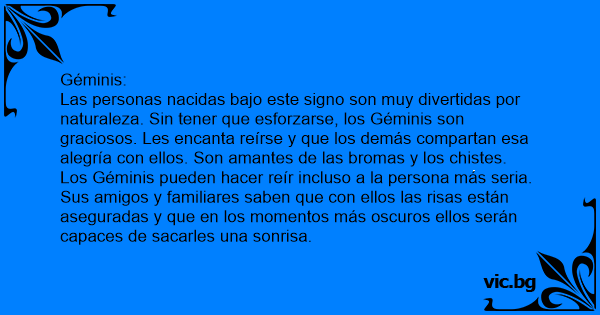 Las personas nacidas bajo este signo son muy divertidas por naturaleza. Sin tener que esforzarse, los Géminis son graciosos. Les encanta reírse y que los demás compartan esa alegría соn ellos. Son amantes de las bromas y los chistes.