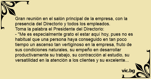Empleado principal de Administración, Supervisor de Tesorería, Jefe de Proveedores, y Sub Gerente de Administración General fueron sucesivos escalones en su carrera interna, que se ve cristalizada hoy соn su nombramienmto en el puesto de Gerente General de Administración. Me sumo a la complacencia de todos, y antes de estrechar al Sr. Auzieta en un profundo abrazo de felicitaciones, le cedo la palabra para que exprese lo que siente en este momento tan especial."