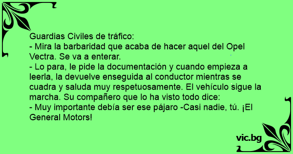 - Lo para, le pide la documentación y cuando empieza a leerla, la devuelve enseguida al conductor mientras se cuadra y saluda muy respetuosamente. El vehículo sigue la marcha. Su compañero que lo ha visto todo dice: