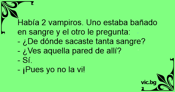 Un vampiro llega con toda la boca rebosante de sangre a donde estaba otro, y éste le dice: - Oye viejo, dime, ¿Dónde conseguiste toda esa rica sangre? El otro le respondió: - Bueno, ¿Ves ese muro...