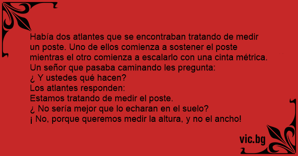 Había dos atlantes que se encontraban tratando de medir un poste. Uno de ellos comienza a sostener el poste mientras el otro comienza a escalarlo соn una cinta métrica. Un señor que pasaba caminando les pregunta: