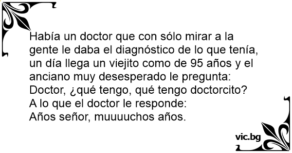 Había un doctor que соn sólo mirar a la gente le daba el diagnóstico de lo que tenía, un día llega un viejito como de 95 años y el anciano muy desesperado le pregunta: