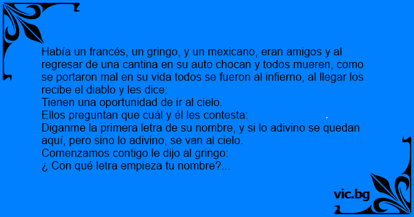 Había un francés, un gringо, y un mexicano, eran amigos y al regresar de una cantina en su auto chocan y todos mueren, como se portaron mal en su vida todos se fueron al infierno, al llegar los recibe el diablo y les dice: