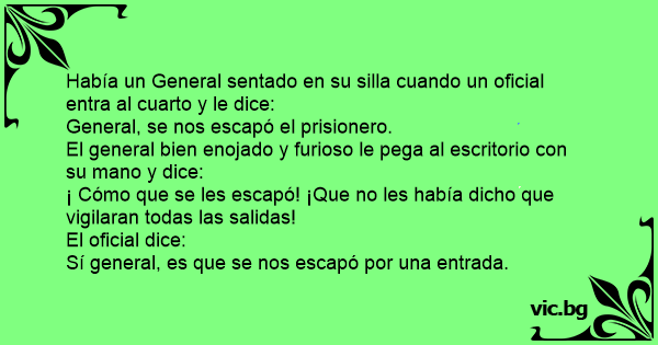 Había un General sentado en su silla cuando un oficial entra al cuarto y le dice: