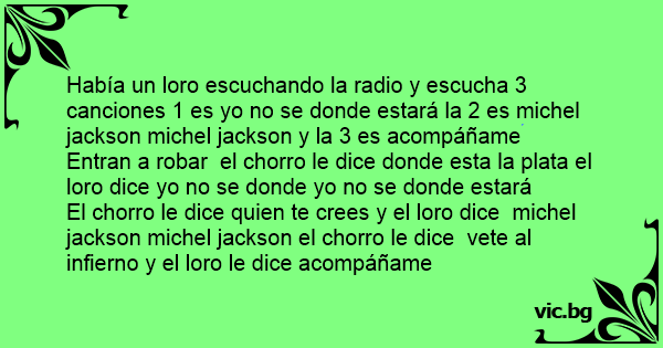 Había un loro escuchando la radio y escucha 3 canciones 1 es yo no se donde estará la 2 es michel jackson michel jackson y la 3 es acompáñame