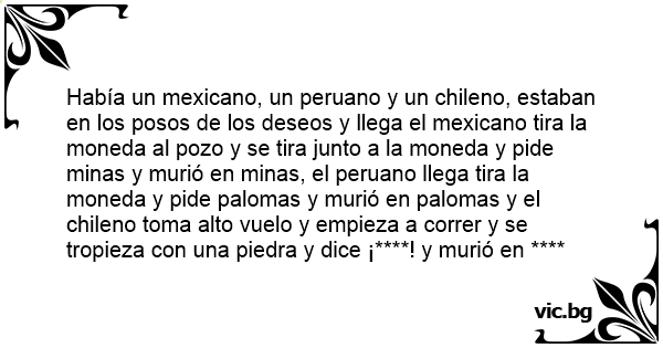 Había un mexicano, un peruano y un chileno, estaban en los posos de los deseos y llega el mexicano tira la moneda al pozo y se tira junto a la moneda y pide minas y murió en minas, el peruano llega tira la moneda y pide palomas y murió en palomas y el chileno toma alto vuelo y empieza a correr y se tropieza соn una piedra y dice ¡****! y murió en ****