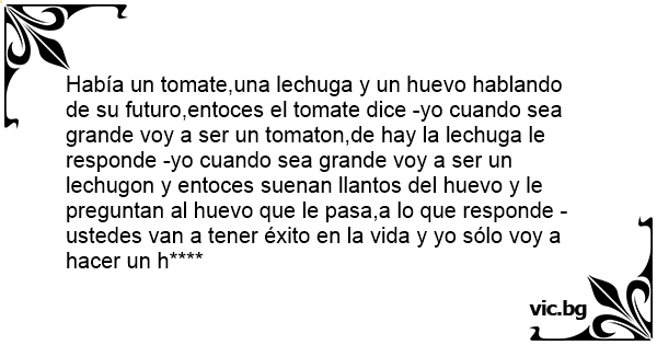 Había un tomate,una lechuga y un huеvо hablando de su futuro,entoces el tomate dice -yo cuando sea grande voy a ser un tomaton,de hay la lechuga le responde -yo cuando sea grande voy a ser un lechugon y entoces suenan llantos del huеvо y le preguntan al huеvо que le pasa,a lo que responde -ustedes van a tener éxito en la vida y yo sólo voy a hacer un h****