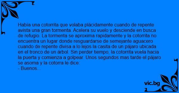 Había una cotorrita que volaba plácidamente cuando de repente avista una gran tormenta. Acelera su vuelo y desciende en busca de refugio. La tormenta se aproxima rapidamente y la cotorrita no encuentra un lugar donde resguardarse de semejante aguacero cuando de repente divisa a lo lejos la casita de un pájaro ubicada en el tronco de un árbol. Sin perder tiempo, la cotorrita vuela hacia la puerta y comienza a golpear. Unos segundos mas tarde el pájaro se asoma y la cotorra le dice:
